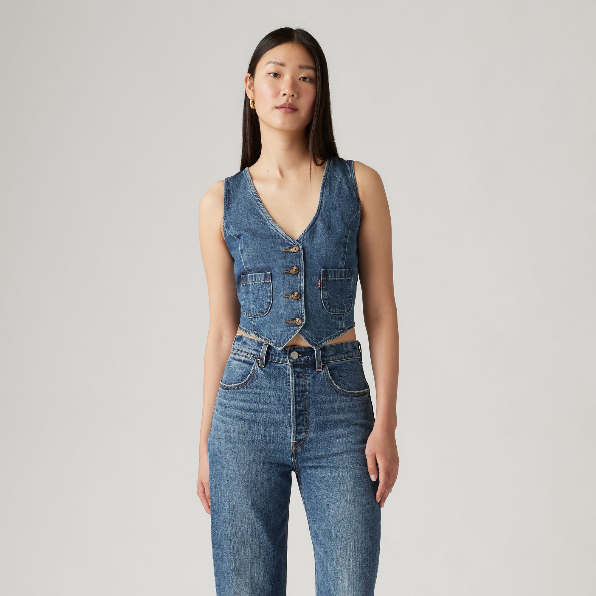 Our Tailored Denim Vest was designed for day to night. and everything in between. It features an easy standard fit. a button-up front and a tailored design.