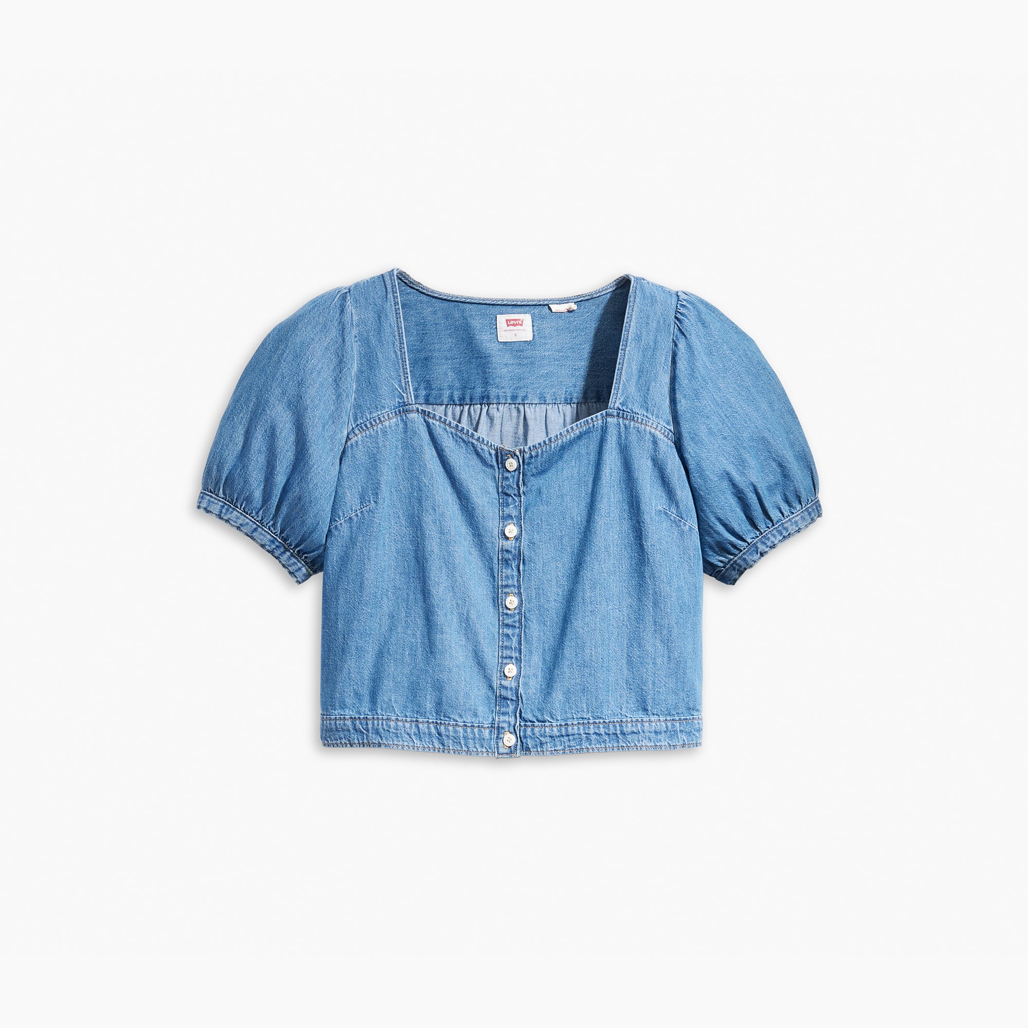 Our Simone Top feels like spring. With a cropped. relaxed fit. it features a sweetheart neckline. a button-up front and short voluminous sleeves.